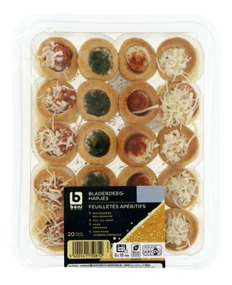 Misschien wel het leukste aan de feestdagen: hapjes! Deze onweerstaanbare bladerdeeghapjes zijn er in 4 smaken: bolognese, vol-au-vent, kaas en ham-kaas.
