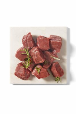 Deze stukjes vlees met milde wildsmaak zijn ideaal om lang te stoven tot het superzacht wordt (zo’n 4 uur op een laag vuur). Lekker met gebakken krieltjes of een groentepuree. Oorsprong: Europa