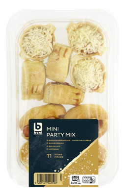Met deze gevarieerde mix serveer je feestelijke hapjes waar groot én klein van zullen smullen: worstenbroodjes, bolocups, mini-burgers en -hotdogs. Er is voor elk wat wils!