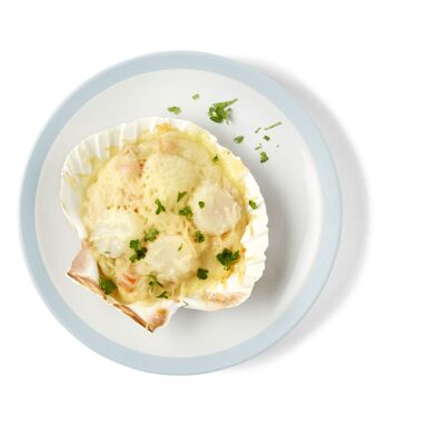 Een heerlijk, luxueus voorgerechtje met brunoisegroenten en coquilles.