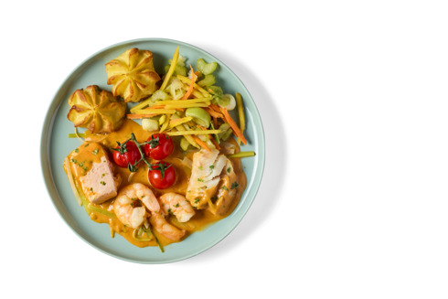 Dit hoofdgerecht met zalm, kabeljauw en scampi is er eentje voor de echte visliefhebbers. In een fijne garnalenjus en feestelijk gegarneerd met preitopping, trostomaatjes, fijne groentjes en pommes duchesse.
